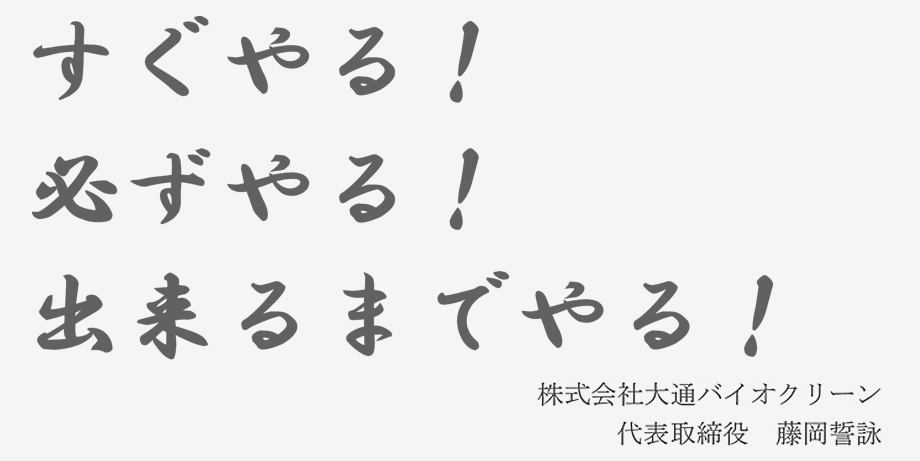 大通バイオクリーンは「正義と愛と人情」のもとに出会いを大切にし、皆様に愛される会社を目指し徹底した お客様第一主義を貫きます。
