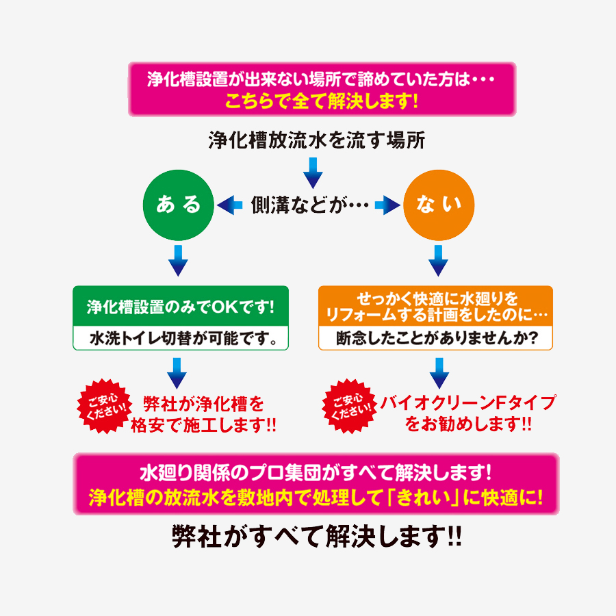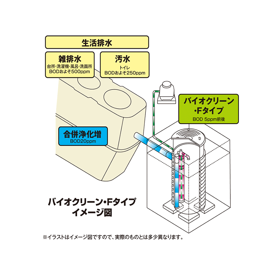 当社販売のバイオクリーンFタイプは、下水施設がなく、放流する側溝・河川がない場所でも、コンパクトな施工で合併浄化槽が設置を可能にする敷地内処理装置です。