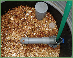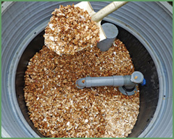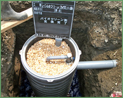 スコップ等を使用して、槽内のバイオクリーン剤の天地換えを行ないます。 またバイオクリーン剤の量が減少している場合 には、バイオクリーン剤の補充をして下さい。 |