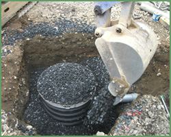 埋め戻し剤は、25mm程度の砂利又は5号砕石を使用して下さい。 C40-0等では締まりすぎて浸透し難くなるおそれがあります。 |